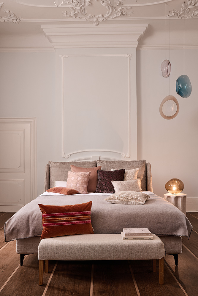 Ein wirklich schön gestalteter Raum entsteht, wenn alle Wohnaccessoires gekonnte zusammenspielen. Es geht darum, eine visuelle Harmonie zu schaffen, in der verschiedene Muster und Strukturen miteinander tanzen, ohne sich gegenseitig die Show zu stehlen. Unsere Kissen aus der The New Chateau-Kollektion sind Meister darin, Licht, Form und Textur zu einem stimmigen Ganzen zu verbinden. Das Kissen Palladium ist der Inbegriff von stiller Raffinesse. Sein geometrisches Muster entsteht nicht durch Farbe, sondern durch fein erhabene Fäden, die fast wie eine zarte Ton-in-Ton-Stickerei wirken. In Kombination mit dem subtilen Matt-Glanz-Effekt der Garne fängt es das Licht auf immer wieder neue, faszinierende Weise ein. Es ist ein Kissen für den zweiten Blick, das seine wahre Schönheit im Detail offenbart. Mit dem Kissen Parquet holen Sie sich den Charme eines Pariser AltbauAppartements direkt auf Ihr Sofa. Das feine, zweifarbige Muster ist eine klare Hommage an kunstvoll verlegte Mosaik-Parkettböden. Es verleiht dem Raum eine subtile grafische Tiefe und eine nostalgische Note, während sich das Material wunderbar weich und kuschelig anfühlt. Das Kissen Noble verführt mit einem sanften Schimmer. Sein zart aus- gearbeitetes, geometrisches Muster auf Premium-Velours spielt elegant mit dem Licht. Je nachdem, wie die Sonne darauf fällt, treten neue Nuancen und Facetten hervor. Es ist ein Statement von dezentem Luxus, das Wärme und eine sinnliche Tiefe in jede Kissenlandschaft bringt. Beim Kissen Lunette wird der Stoff zur Leinwand. Das aufwendig bedruckte Velours entfaltet eine dreidimensionale, fast magische Tiefenwirkung, die an ein kunstvolles Wasserzeichen erinnert. Es ist ein echter Blickfang, ein Kissen, das wie ein abstraktes Gemälde wirkt und jedem Raum eine mutige, künstlerische Note verleiht. Um diese ausdrucksstarken Stücke perfekt in Szene zu setzen, kombinieren Sie sie mit ruhigen Partnern. Ein unifarbener Kissenbezug aus unserer Cloud- oder Soul-Kollektion schafft die nötige Ruhe und lässt die The New Chateau-Kissenhüllen noch mehr strahlen. Ob Sie Ton-in-Ton bleiben oder bewusste Kontraste setzen: die Kombination aus gemusterten Kissen und Kissenhüllen in uni sorgt immer für eine lebendige und zugleich ausgewogene Harmonie.