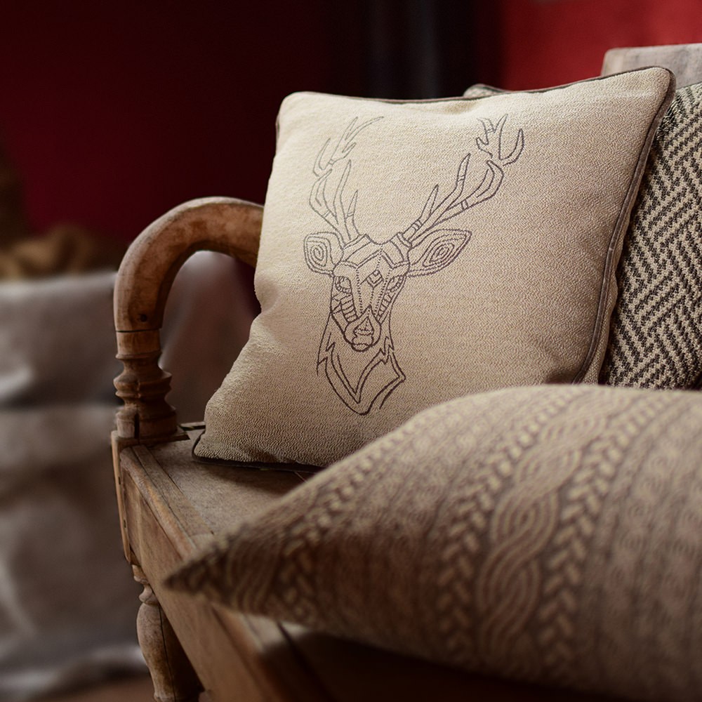 Chalet – die Kollektion für Gipfel-Bezwinger und Schneestürmer lädt uns mit Motiven mit Alpenflair zum gemütlichen Kuscheln ein und bringt mit grob gewebten Strukturen und raffinierten Mustern eleganten Charme auf die Couch.